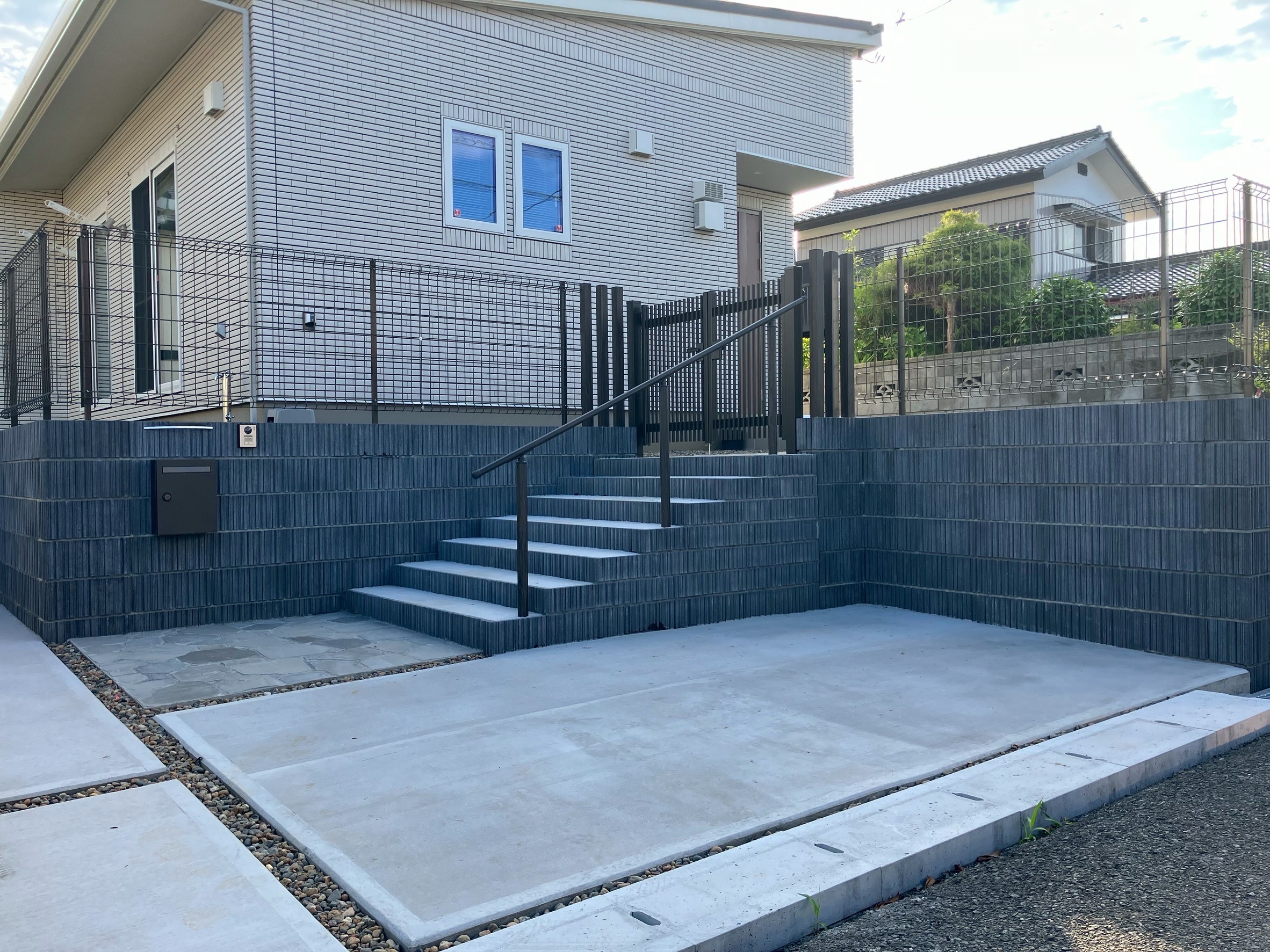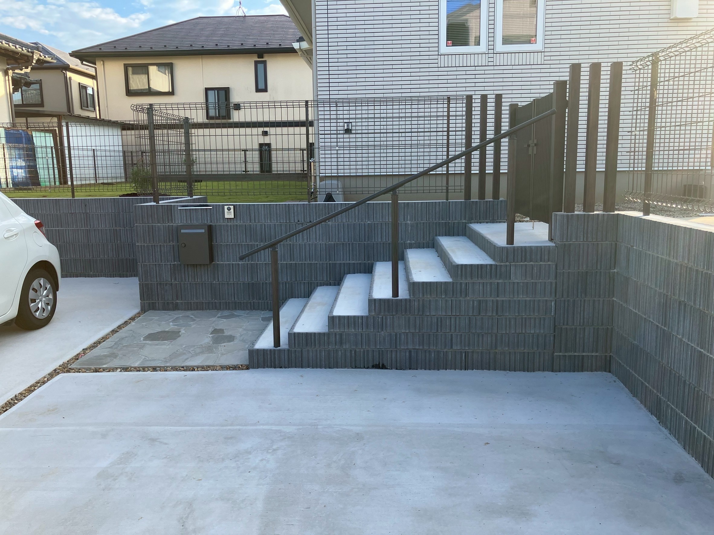 シンプルな外構のアクセントとして、階段下の一部分をグレーの乱貼りに仕上げました。